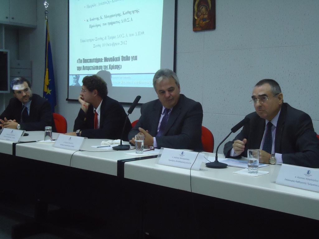 Ομιλητές στην ημερίδα ήταν οι: κ. Ιωάννης Μουρμούρης, Καθηγητής και Πρόεδρος του Τμήματος Δ.Ο.Σ.Α, ο κ. Δημήτρης Πολιτόπουλος, Πρόεδρος και Δ/νων Σύμβουλος της εταιρείας «Ζυθοποιία Μακεδονίας – Θράκης» (ΒΕΡΓΙΝΑ) και ο κ. Κώστας Αξαρλόγλου, Επίκουρος καθηγητής του τμ. Δ.Ο.Σ.Α.